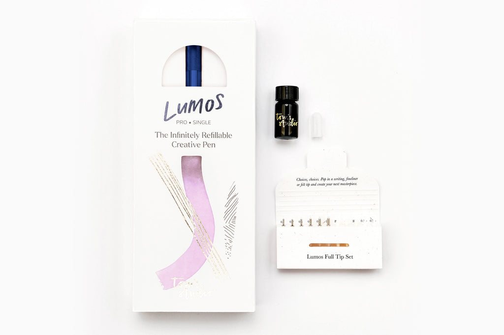 Infinitely refillable, the Lumos Pro is a felt-tip fineliner pen that allows you to choose the writing tip and ink colour of your choice. Made of durable anodized aluminum, the pen is perfect for any analog drawing or writing kit. Each pen comes with the Lumos Full Creative Tip Set, which includes the following tips: