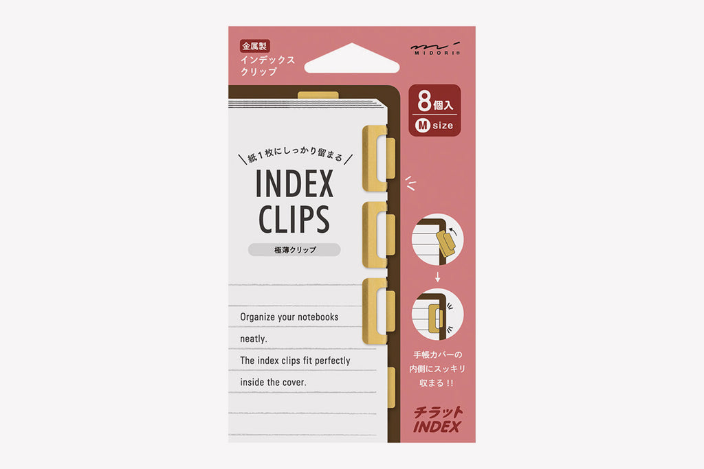 Keep track of important reading passages or the latest page in your journals and novels with these ultra-slim Chiratto Index Clips by MIDORI. Made of metal just 0.15mm thick, they won't add any unnecessary bulk or cause damage to your pages.